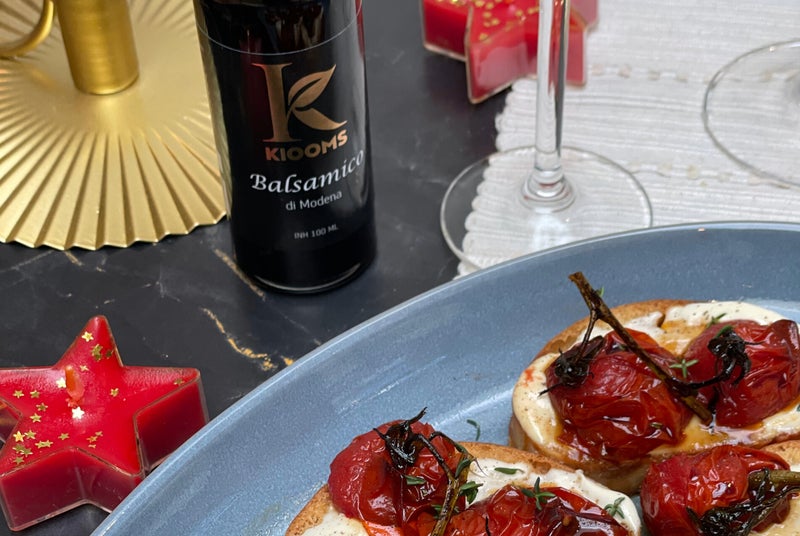 Een lekker feestelijk vegetarisch borrelhapje die je in een handomdraai hebt gemaakt. Door de tomaatjes met de balsamicoazijn en honing te roosteren smaken ze extra lekker.